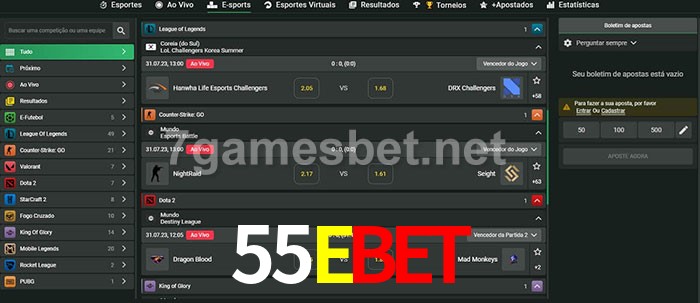 O 55Ebet oferece uma grande seleção de opções de apostas em e-sports com probabilidades competitivas